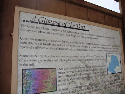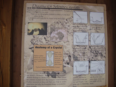 When you first enter the salt plains of the digging area, there is a building with a restroom, a parking area, and a shelter with information about the history of the Great Salt Plains and Selenite Crystals.
