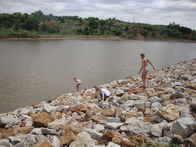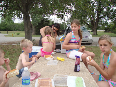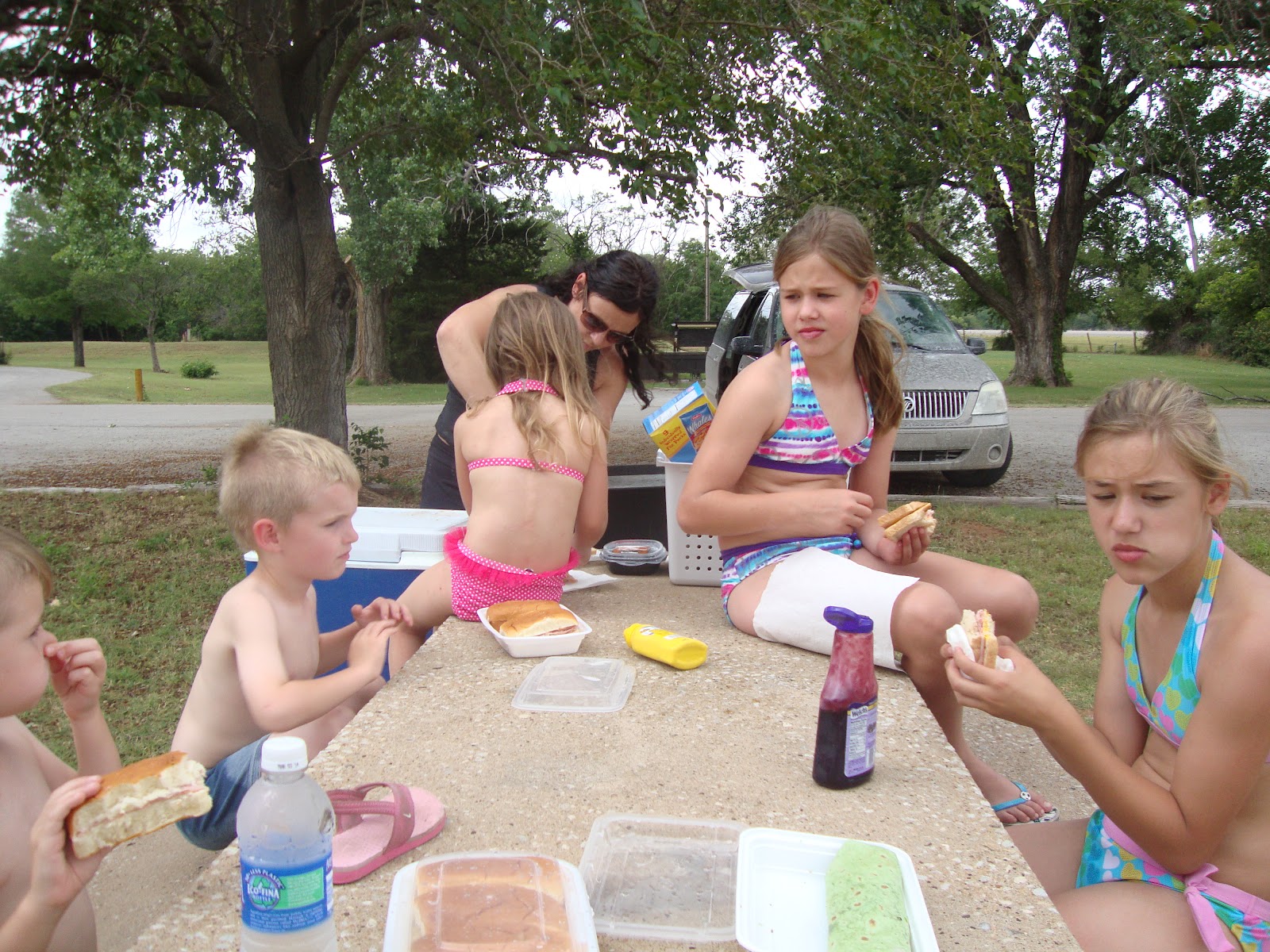 We were hungry and decided it was time to pull out our picnic and eat. We had a hard time figuring out where the swimming area was, and were really in a time crunch, so we abandoned the idea of swimming and just found a picnic table near the camping area. There were some water pumps where we could rinse off and the kids all stripped down to their swimsuits to take full advantage of the refreshing water!