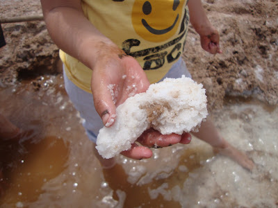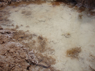 About a foot or so beneath the surface there is water, about half as salty as ocean water. It’s amazing how clear it is in areas where it’s been sitting and settling for a while. You can see the ridge like salt deposits on the side of this little pool.