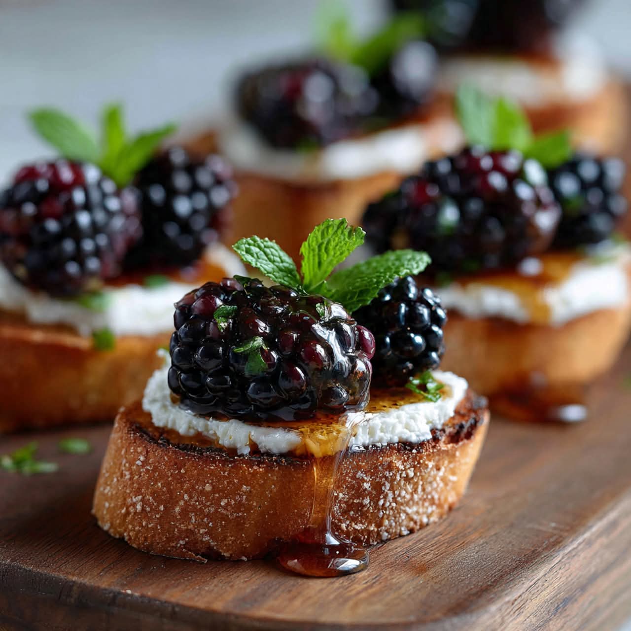 - Cut blackberries in half and arrange on top of goat cheese. Drizzle honey and sprinkle salt on top.