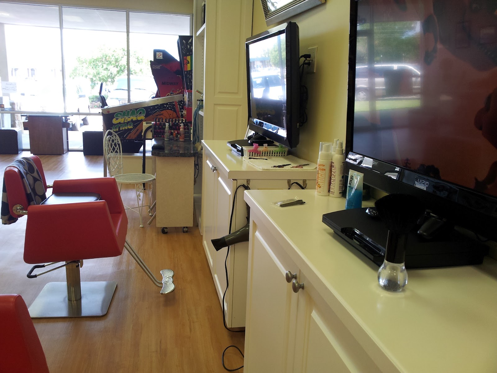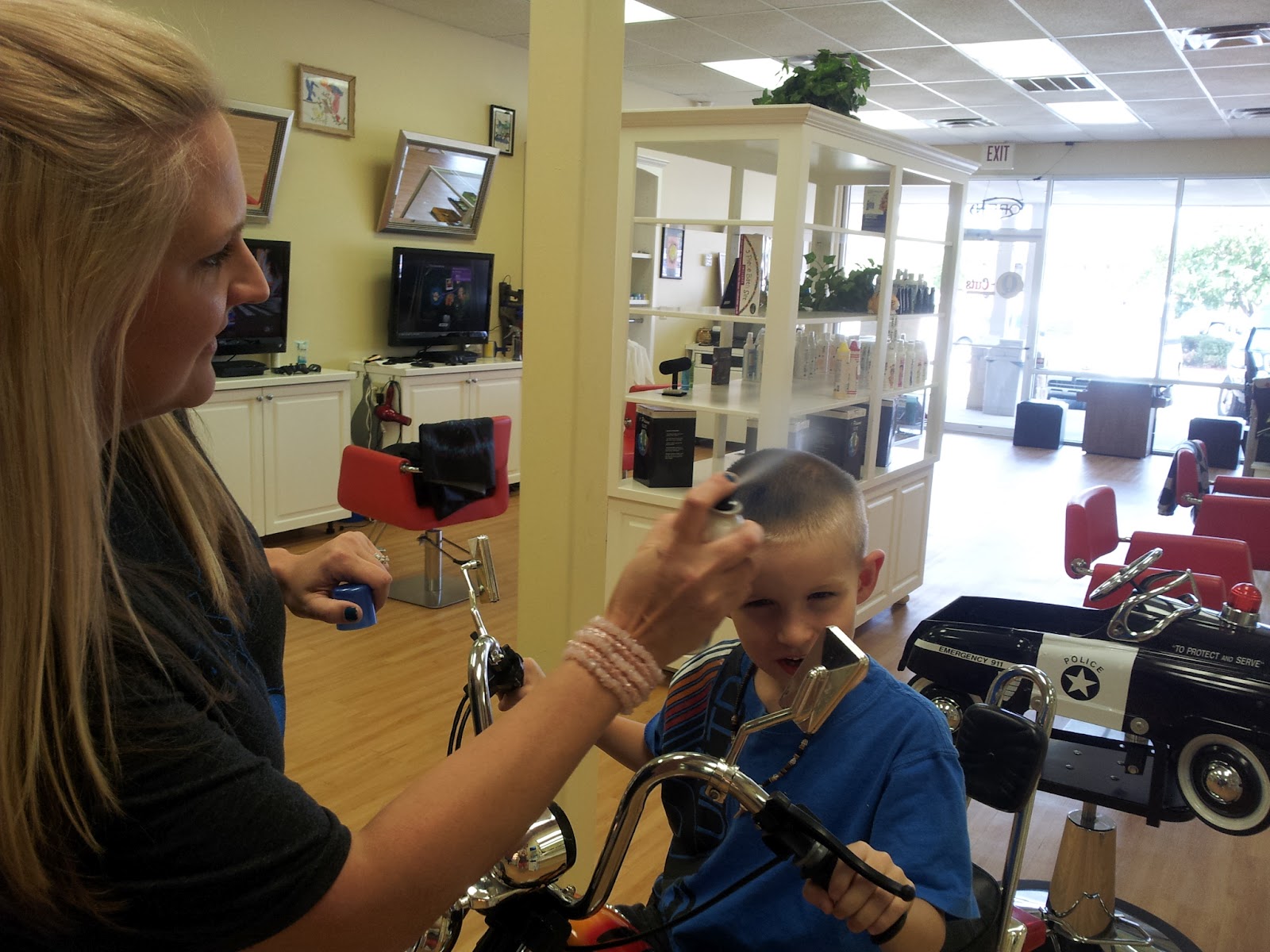 The salon is very spacious, with plenty of booths to serve several children at a time. The booths for smaller children have cars and motorcycles for the kids to sit in, and EVERY chair has a flat screen TV with cartoons playing! No complaining from the littlest bee getting his mohawk trimmed up!