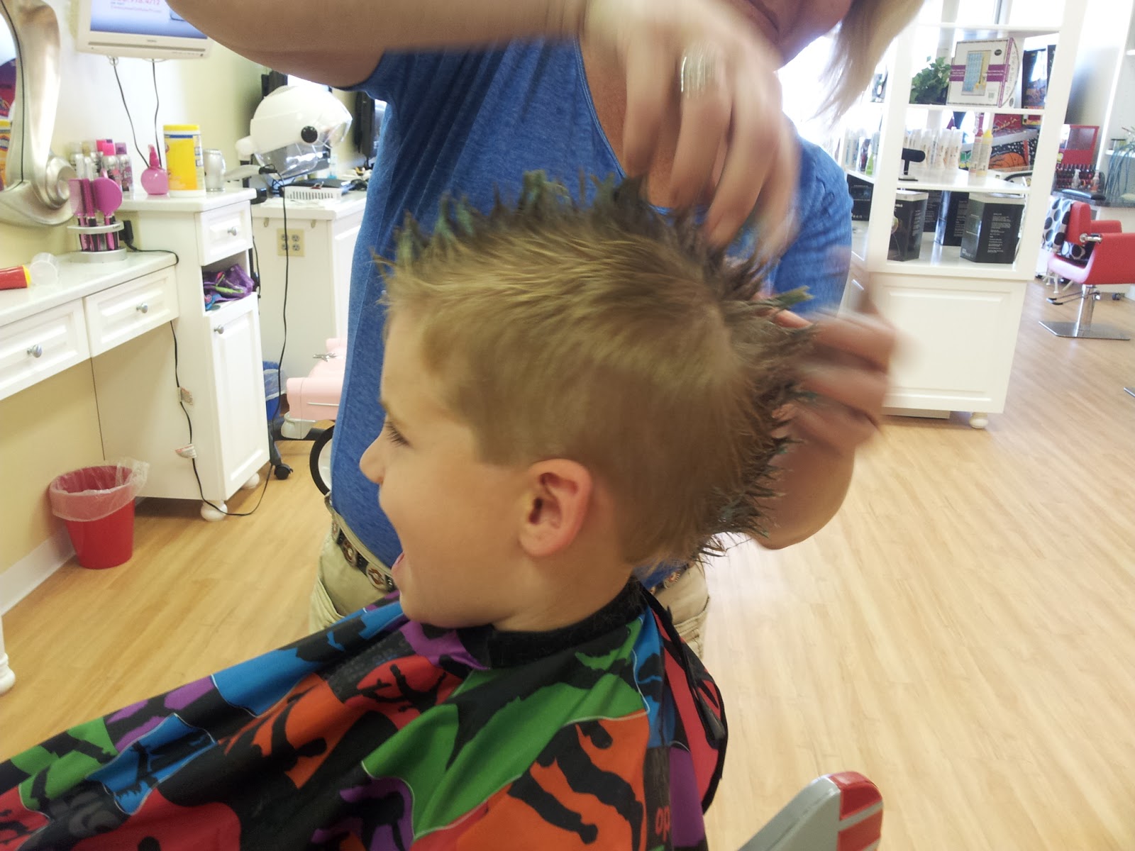 I love the fun extra touch that every kid gets colored gel or hairspray if they want (and Mom approves)! Aidan picked blue.
