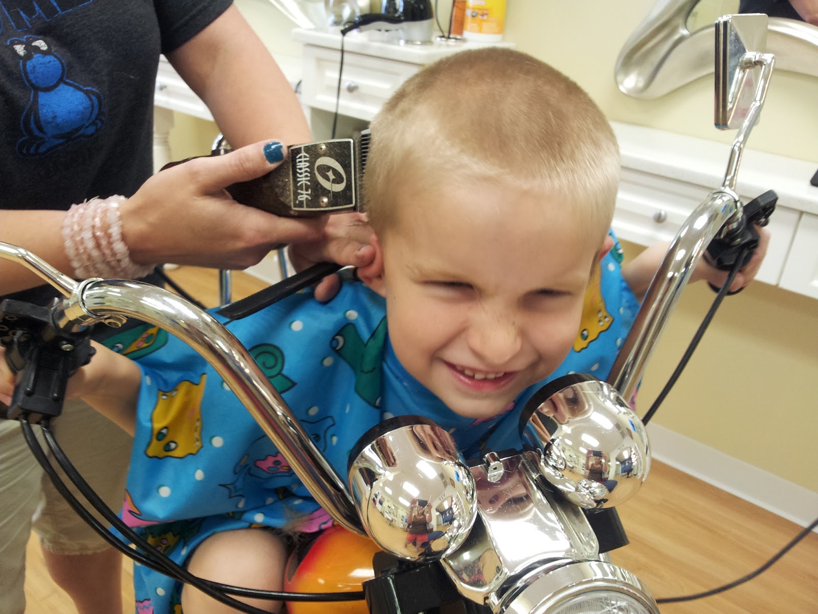 No complaints from Aidan getting his buzz cut (which he calls his “Bald Eagle Hair Do”) cleaned up while he buzzed along on his killer motorcycle!