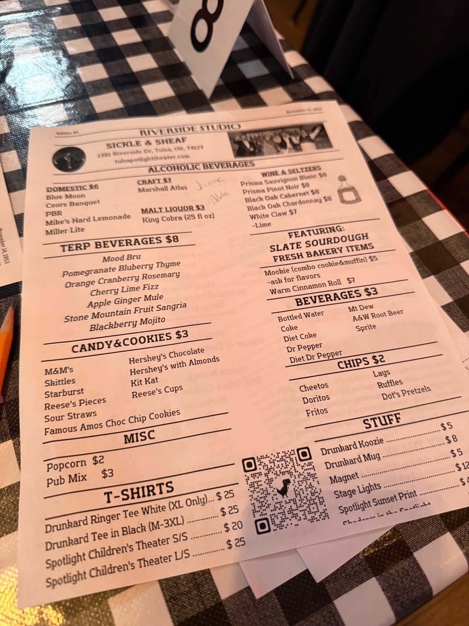 When you arrive, you’ll check in at the box office, and then someone will show you to your seat. Everyone sits at a table, and there is a nice menu to order from as you wait for the show to begin. A couple of volunteers will come to take your order. We ordered a couple of Mood Brus and popcorn (the popcorn was just $2, which was appreciated!). Other options include beer and wine/seltzer, soda, chips, candy, cookies, etc. So you’ll want to eat dinner ahead of time, but being able to snack and sip while there is certainly a nice aspect.