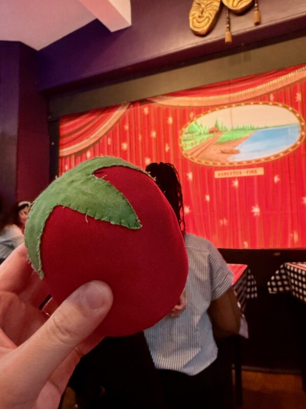 The audience participation comes in mainly when it is time to BOO the villain (Harvey Green) and CHEER for the hero (Willie Hammond). Plus, for just $1, you can rent a cloth tomato to throw at the villain when the time comes. This tomato-throwing bit went on for a few minutes, and the villain had a wonderful time taunting the audience. (Joss actually got called up on stage to help clean up the tomatoes before the third act. They gave him a KitKat in appreciation!) Before the show begins, one of the cast members will walk you through how to boo/cheer, to help everyone get comfortable with this kind of vocal participation.